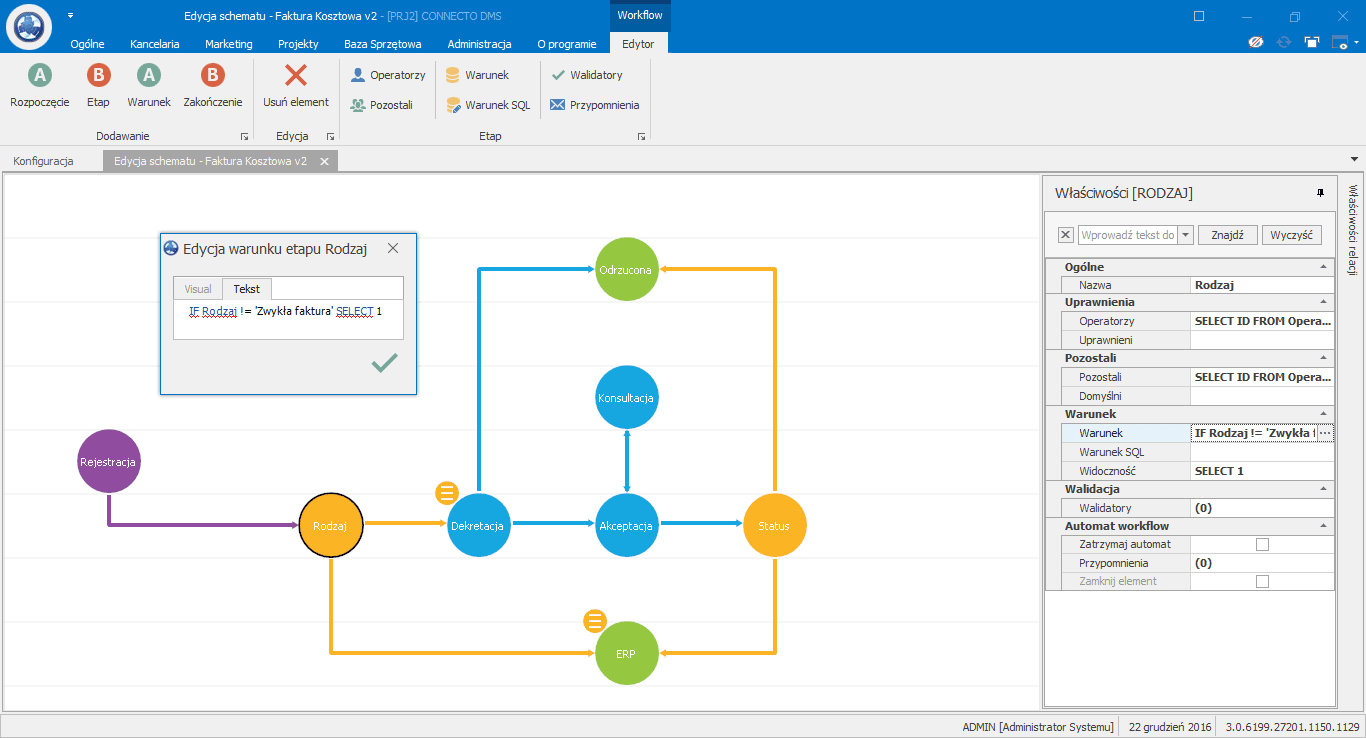 To, w jaki sposób i do kogo trafi faktura jest całkowicie zależne od osób wybierających system. Przy analizie przedwdrożeniowej ustalana jest ścieżka obiegu dokumentu wraz z wszelkimi akceptacjami i odrzuceniami dokumentu. Powyższy screen jest tylko przykładem. Obieg dokumentu faktury jest dowolny i odzwierciedla ten, który wykorzystywany jest w firmie w formie papierowej.